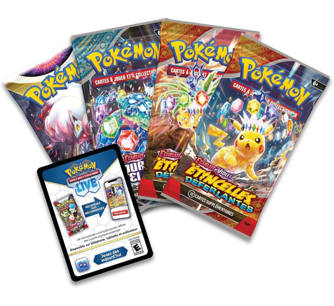4 boosters du JCC Pokémon (2x EV8 Etincelles Déferlantes + 1x EV7 Couronne Stellaire + 1x EB11 Origine Perdue)